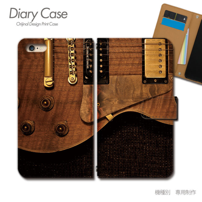 手帳型のスマホケース一面にエレキギターが映し出されたスマホケース。