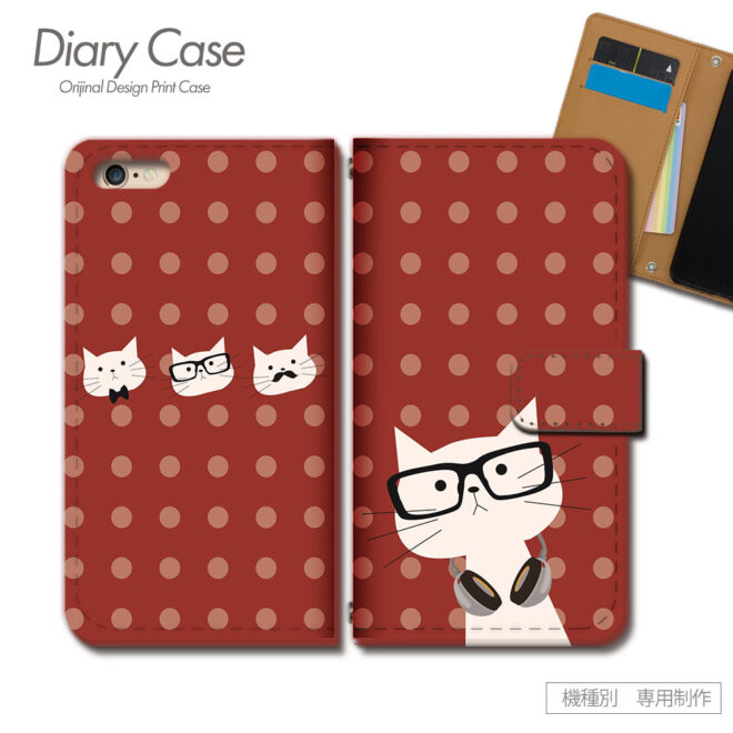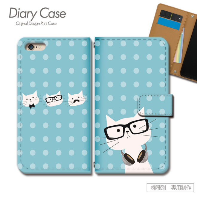 こちらもネコのデザインのスマホケースですが、こちらは背景がドット柄になっており、メガネとヘッドホンをしているネコが特徴的です。