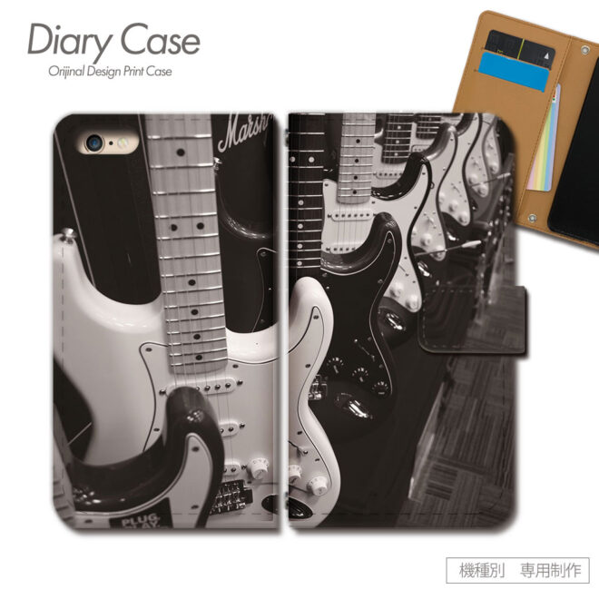 さまざまなエレキギターが並んでいるデザインのスマホケース。