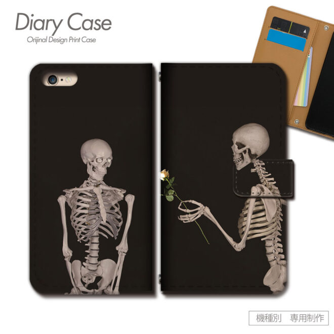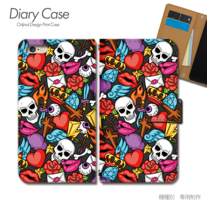 手帳型になったスマホケースいっぱいにドクロやバラの花、ハートが散りばめられているデザインになっています。